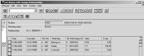 If invalid position-oriented relationships exist, they are visible through Maintain Position transaction PO13. From PO13, enter the position number that contains the invalid relationship, select the Relationships infotype, and click on the overview icon (or press shift + F8). This takes you to a screen that gives you an overview of relationships, as seen in Figure 1. The invalid object is indicated by question marks where the description (in Figure 1, the name of the person) would normally be.