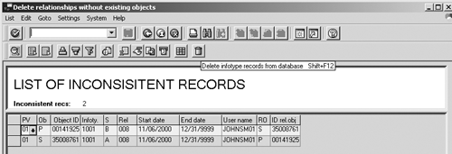 For example, when you try to delete a relationship between a valid position object and a personnel number that no longer exists in the R/3 database, the process terminates with the error message Personnel number does not exist. What has occurred is that either the source or target object in the table that stores Xobject relationships, HRP1001, still exists as an entry in that table. However, the actual object has already been removed from the R/3 database.