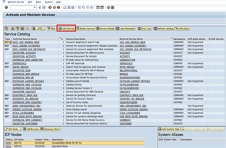 Back in the Activate and Maintain Service screen (Figure 10) you can see the registered MSS OData service listed in the Service Catalog. Double-click the service and the registered OData service and the System Alias information appear in the bottom of the screen (under ICF Nodes and System Aliases, respectively). Follow these same steps to register all of the HR Renewal 1.0-related OData services (listed in Table 1) in the same way.