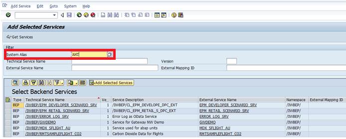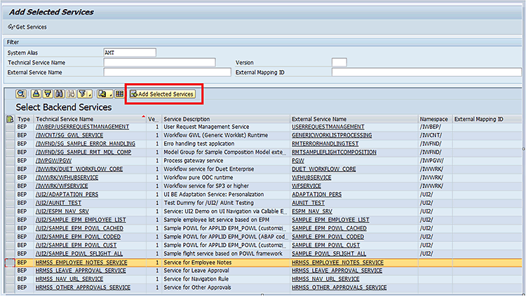 Using the right-click Help option in the System Alias field, choose the SAP back-end system (in this case, AMT). Once the System Alias name is selected, click the Get Services button (Figure 3) and a screen opens that displays all the OData services available in the corresponding SAP back-end system (Figure 4). These MSS-related OData services are the same ones as listed in Table 1. (Not all of the MSS OData services are shown in the figure—just some of the options, which are highlighted with a red box).