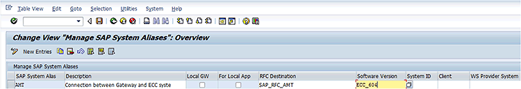 and the screen shown in Figure 5 opens. Here you can define the SAP System Alias and maintain the Remote Function Call (RFC) destination for your SAP back-end systems by clicking the New Entries button. After defining the SAP System Alias information, click the save icon