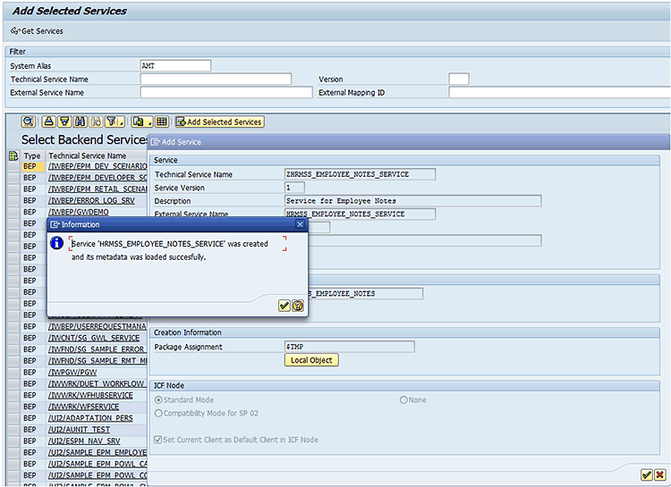 in the bottom right of the screen. This opens another pop-up screen with the message Service 'HRMSS_EMPLOYEE_NOTES_SERVICE' was created and its metadata was loaded successfully (Figure 8). Click the green checkmark icon in this window to confirm the action, which takes you back to the screen in Figure 9. Then click the back icon to see the registered service (Figure 10).