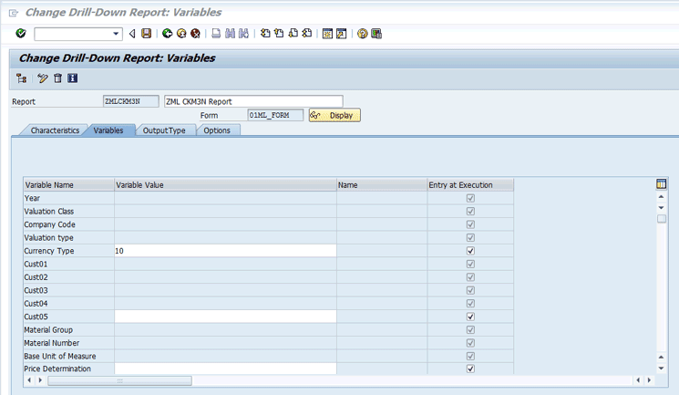 Sometimes there is a need to create variables for calculation of the period and year based on selection parameters. The selection parameters are based on which data is to be fetched and displayed in the report output developed in a material ledger report. SAP has provided standard global variables that you can use in this report. To create, change, and display variables, execute transaction code KKMLV. Figure 5 shows all the variables that SAP has provided.