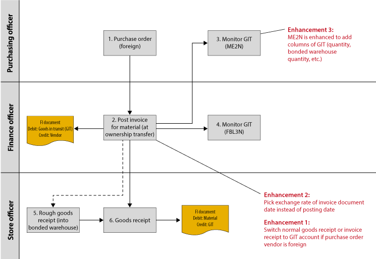 If a PO is for a foreign vendor, this enhancement changes the normal GR/IR account to be used at the time of IR and GR with your choice of account, which in this case is the GIT G/L account. The following enhancement point and code are used: