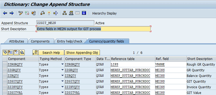 In the next screen (Figure 10) click the create icon (the fourth icon from the right) to create a new append structure. In the pop-up screen that appears, enter the name of the new append structure (ZZGIT_ME2N) and click the green check mark or press Enter.