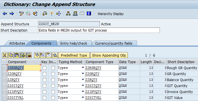 To create your own field descriptions and field headings to be displayed in the ME2N report, you need to be able to specify field labels for all the fields in the append structure. Therefore, you need to create your own component types. Double-click each component type and define a Data Type (e.g., domain MENGE13) and Field Label as shown in Figures 12 and 13, respectively.