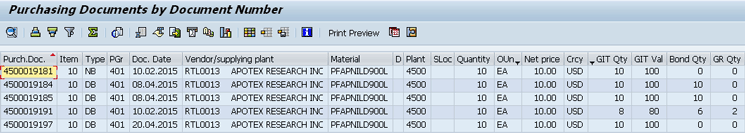 List of PO line items with GIT and bonded quantities