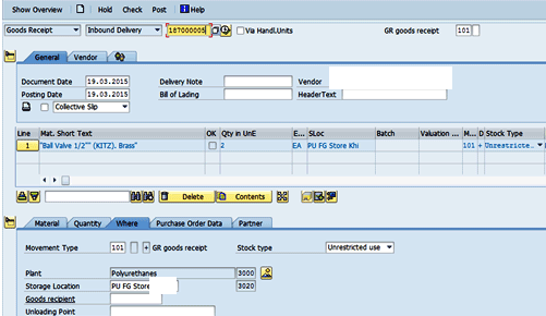 Upon physical arrival of goods at the company’s premises, the store officer enters a GR using transaction code MIGO. In the screen that opens, select Inbound Delivery from the drop-down list of options in the field at the top of screen. Enter a rough GR number in the field beside the Inbound Delivery. Under the Where tab, enter 101 in the Movement Type field, select the OK check box in the row in which your line item is entered, and then click the Post button as shown in Figure 31.