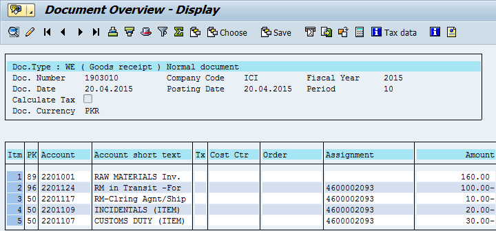 After you post the GR document, the system debits the material stock account and credits the special GIT G/L account (due to enhancement 1). The GIT G/L account is cleared after the GR. If delivery costs were added as conditions in the PO, then they are also added to the material value as shown above, where custom duty and incidentals were added. However, the special GIT G/L account is credited with the equivalent amount that was debited at the time of invoice posting (Figure 32).