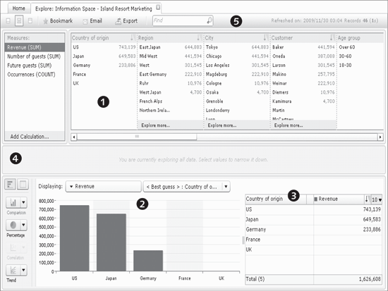 - Bullet 2 is a visualization of the data. BusinessObjects Explorer makes a proposal for the data visualization based on how many and which type of measures you select.