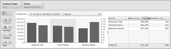 6. Click the Comparison visualization chart icon along the left, and select Dual axis, which is the sixth option in the drop-down menu (Figure 18). In the table on the right side, the Bahamas Beach resort has the highest number of guests but the lowest revenue.