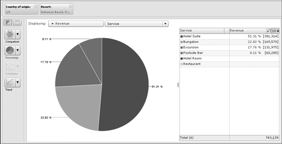 By comparing the three resorts, you can see that the Bahamas Beach resort is selling (viewed by percentage) more Hotel Suite rooms than the other resorts but less Excursion and less Poolside Bar products. Let’s dig more into this information.