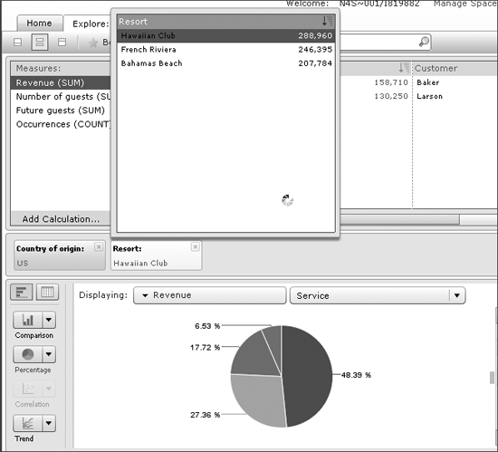 Let’s start exploring the data of your information space. In Figure 12, you see the facet group for Customer and the values based on the selected measure Revenue. In the data visualization section, you saw a comparison chart that showed US as the Revenue per Country of origin. Based on this information, you know that visitors from the United States generate the most revenue. Ideally, you want to understand more about the situation so that you can take the steps necessary to gain even more revenue.
