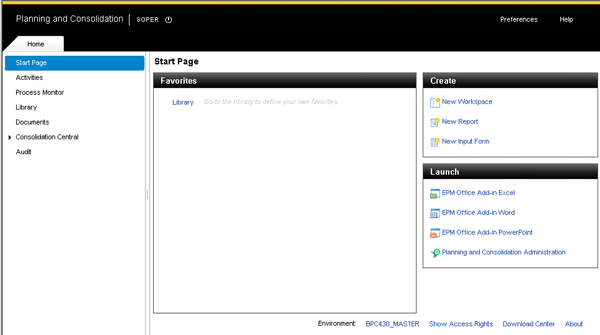 The SAP BusinessObjects Planning and Consolidation Web Client Home workspace