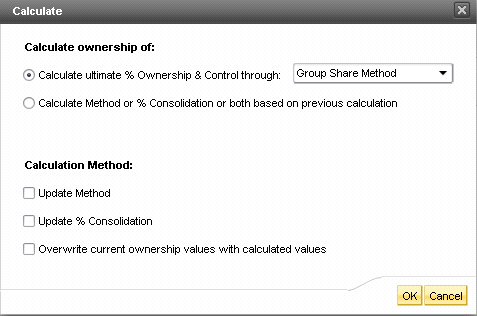 Clicking the Calculate button in the Ownership Manager editor opens the Calculate dialog box (Figure 12). The options in this box allow you to perform different calculations and choose whether to use the results to update the database. In version 7.5, this function is performed via a Data Manager package.