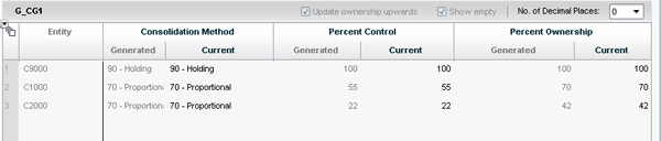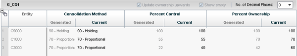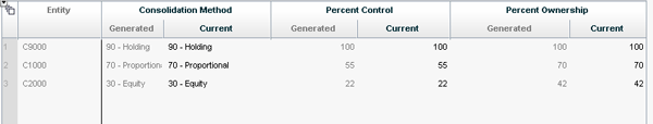 The consolidation method for C2000 is updated to equity because its percent control falls in the range of .00 to .25 as specified in the method’s business rule. In summary, you can see how you can use the ownership calculation to record percentages and methods, which can then be used when consolidation is executed from the Consolidation Monitor.