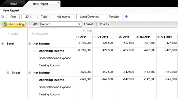 Meanwhile, you can create Web reports and input forms in thin client scenarios via the Create launchpad (Figure 1) with fewer navigation steps. For example, in version 7.x, you launch a Web page, choose Live Reports, and open a Web report. Now you simply click the New Report link and build these reports using drag-and-drop functionality, just as in prior releases. Version 10.0 also supports multiple dimensions in the rows and columns, facilitating the use of Web reports to analyze consolidation data (e.g., without launching the Microsoft Excel client). Figure 2 shows an account by entity trend report developed from the Create launchpad.