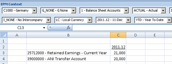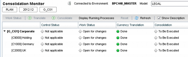 With the Consolidation Monitor, you can gather and consolidate financial data and see the breakdown of this data. As an example, suppose context members ACTUAL, 2010.DEC, and CORPORATE perform a data selection from an ownership model. The result is a hierarchical view of the investment structure in rows (Figure 4). The ownership model (i.e., LEGAL) contains the transaction data for a corporation’s investment structure. In the example, this data includes the corporate holding company (C9000) and its subsidiaries (C1000 and C2000). The Consolidation Monitor provides four statuses — Control Status, Work Status, Currency Translation, and Consolidation — for a more comprehensive view of the data.