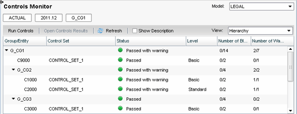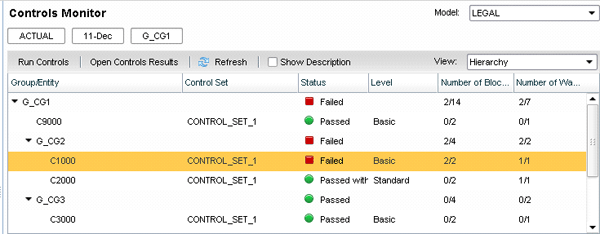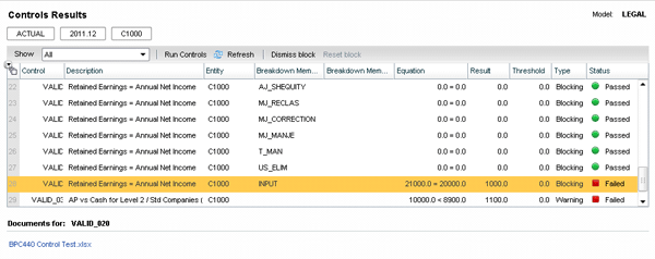 The Controls Monitor includes better visibility of the status of the data validation process, built-in reports called Control Results, which display the numeric comparisons, and hypertext links to Excel input forms, for example, to take corrective action. Figure 5 shows the status of data validation with a failed control for the holding company, C1000. You access the screen in Figure 5 by opening Consolidation Central and selecting Controls. You can then click Run Controls or view the results if they have already run.