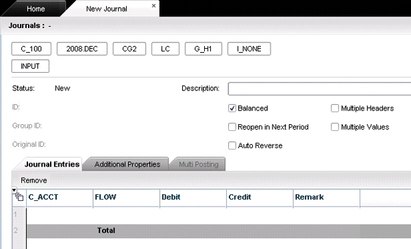 You can create a new journal by selecting Journals from the Consolidation Central list of options (Figure 3) and then clicking the New button in the screen that appears. Figure 9 shows the New Journal tab, which appears when you create a new journal entry. The context members are inherited automatically into the header dimension members, thereby accelerating the manual selection of members.