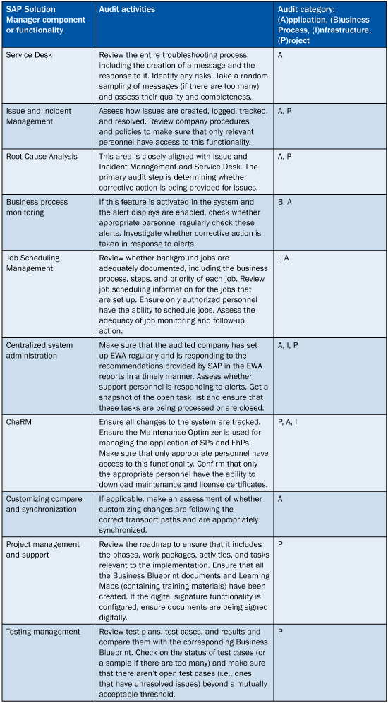 SAP Solution Manager provides a slew of functions and features, so you have to carefully choose areas that are of relevance to the enterprise. Table 1 is a matrix that you can use as a template for putting together your approach to an SAP Solution Manager audit. You can expand or compress the scope of this audit based on the components that are being used. Even within a given component, you can go deeper than suggested because you are not doing a conventional system audit, which is usually done off a transactional or analytical system.