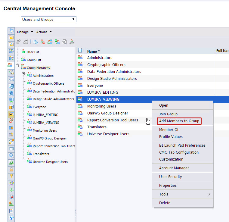 5. After both groups have been created, you can now select these groups from the list on the right of the screen (Figure 4). Right-click one of the groups and, from the context menu that appears, choose an item from the list of options. In my example, select the LUMIRA_VIEWING group, right-click, and select Add Members to Group to add your users to the group based on their authorizations.