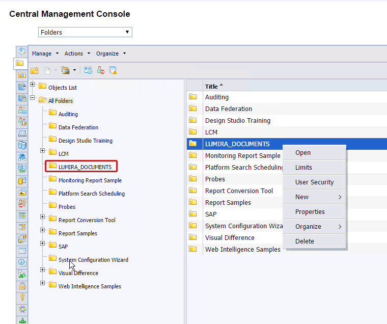 2. In the CMC under Organize, navigate to the LUMIRA_DOCUMENTS folder and right-click your mouse to display the list of options in the context menu (Figure 5).