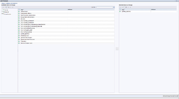 5. Select the LUMIRA_VIEWING group on the left side and, using the arrow in the middle of the screen, add the user group to the Selected Users and Groups section (Figure 7). Click the Add and Assign Security button to display the screen shown in Figure 8.