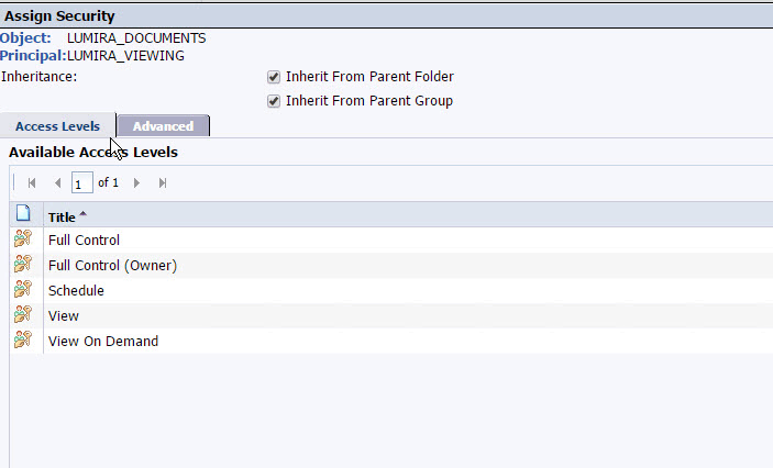 In this screen, you can choose from a list of predefined access levels, such as Full Control, Full Control (Owner), Schedule, View, or View on Demand, or you can navigate to the Advanced area and assign individual rights.