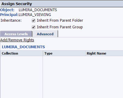 13. Click the Add/Remove Rights link and the Add/Remove Rights screen opens (not shown) in which you can add rights for the LUMIRA_VIEWING group.