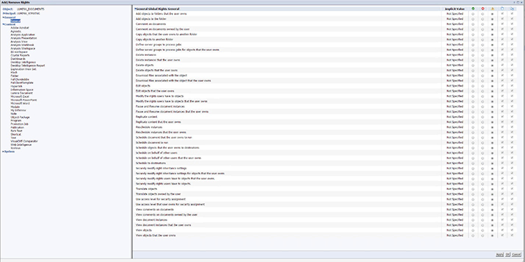 You are presented with a detailed list of user authorizations. On the left side you can choose to use the General area, which means you are assigning the rights independent of the content type, or you can choose to assign the rights for a specific content type, such as Crystal Reports or SAP Lumira.