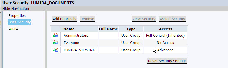 User group LUMIRA_VIEWING is added to the folder LUMIRA_DOCUMENTS