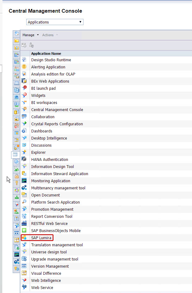 2. In the Central Management Console homepage, select Manage and then Applications from the drop-down list of options, which opens a list of available applications (Figure 12).