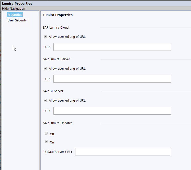 - SAP Lumira Updates radio buttons: Select the On or Off button to specify if automatic updates for SAP Lumira are allowed or not. Especially in a landscape with SAP Lumira desktop and SAP Lumira server you should control the updates as SAP Lumira desktop and SAP Lumira server have to be on the same release level.