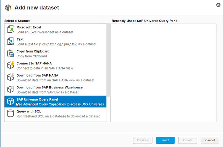 3. For my example, use the SAP Universe Query Panel option as the data source. Select it on the left and then click the Next button.