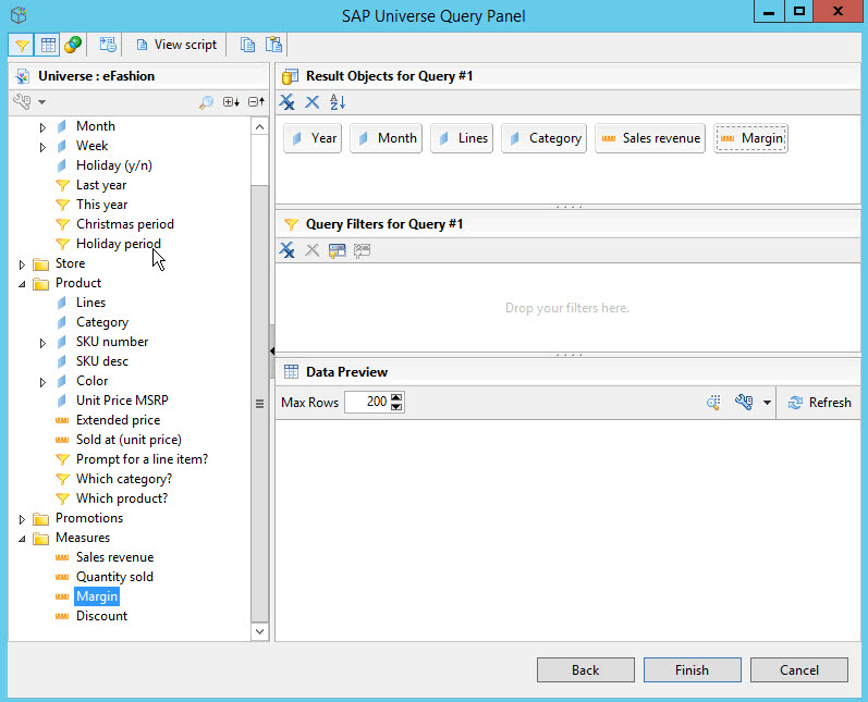 6. For my example, I am using the universe eFashion with the following dimensions and measures (Figure 17):