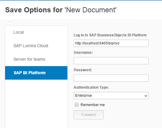 11. Navigate to the menu File > Save and select SAP BI Platform from the options on the left (Figure 20).