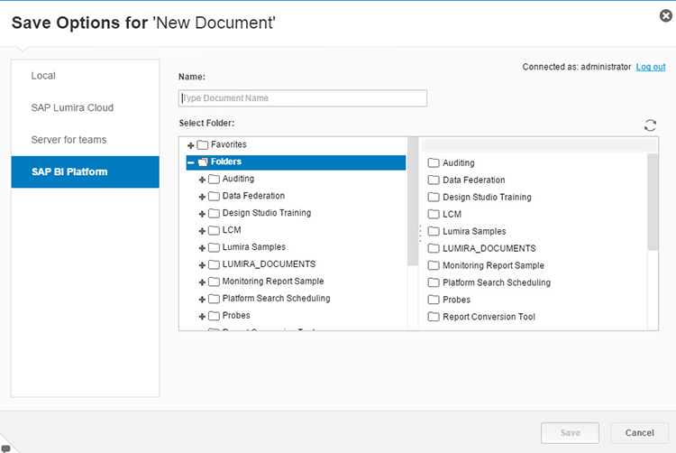 14. Select a folder, enter the name for the SAP Lumira document, and click the Save button.