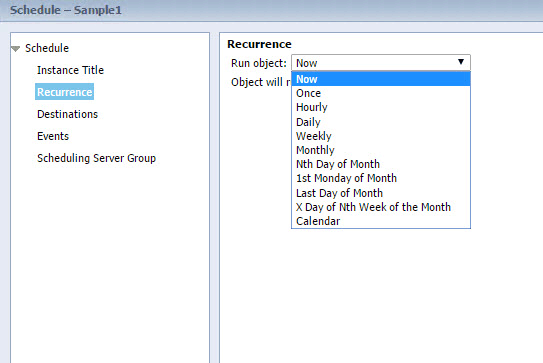 8. In the Recurrence area you can configure how often and when the SAP Lumira document should be scheduled. In this example, select the Now option.