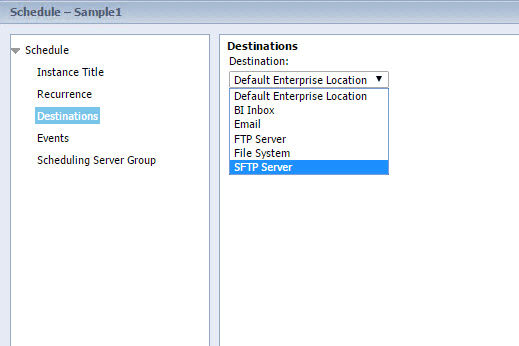 The two remaining options on the left, Events and Scheduling Server Group, allow you to leverage the eventing from the SAP BusinessObjects BI server or to choose specific servers for scheduling. In this example, skip these two areas.