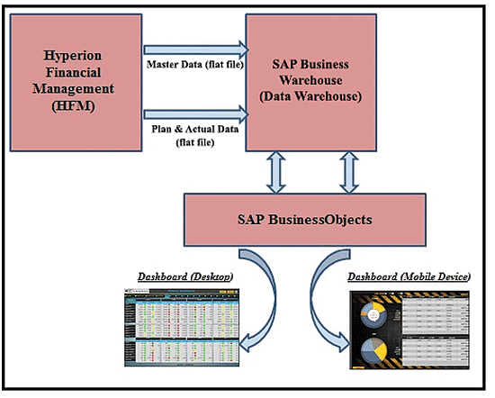 Figure 1 shows the solution in a nutshell. Basically, both financial master data and planning and forecasting data from HFM are provided via flat files on a regular schedule to SAP BW. Various calculations, transformations, and aggregations are then applied to the data in BW. This data is made available to SAP BusinessObjects (Dashboards) via a direct connection (i.e., Business Information Consumer Services [BICS]). When dashboard users access these KPIs from their desktop PCs, laptops, or iPads, the dashboard communicates to BW as needed and BW provides information to the dashboard as appropriate.