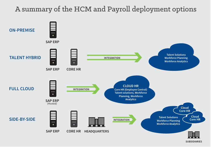 Before I talk about the specific solutions available, I want to remind you that each of these solutions exists within the various deployment environments. The diagram in Figure 1 shows each of the four options that companies have for their SAP/SuccessFactors landscapes. Some are familiar, such as on premise, and some are relatively new, such as the side-by-side model.