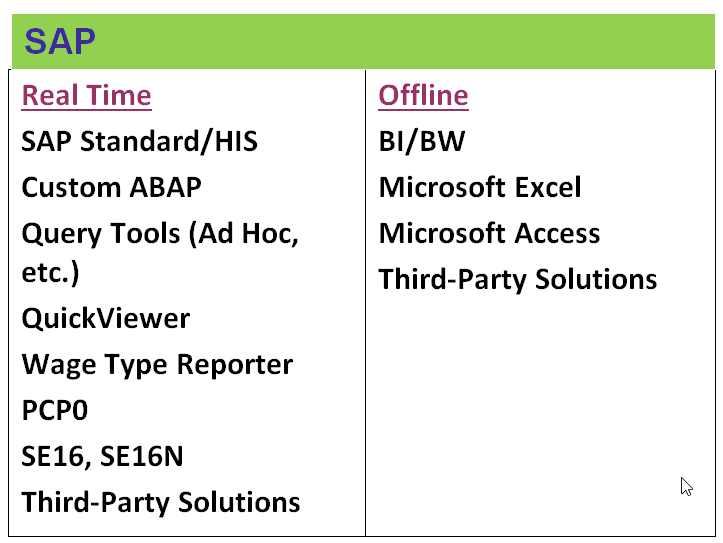 The SAP ERP HCM module is known for its complexity, specifically its challenge with regards to reporting. Unlike other SAP modules, SAP ERP HCM has a large number of sub-modules including Payroll, Personnel Administration, Benefits, Organizational Management, and Time Management. Each of those solutions has its own unique reporting requirements and considerations. Familiarity with the different reporting solutions and understanding which application areas for which they are designed has often been a challenge.