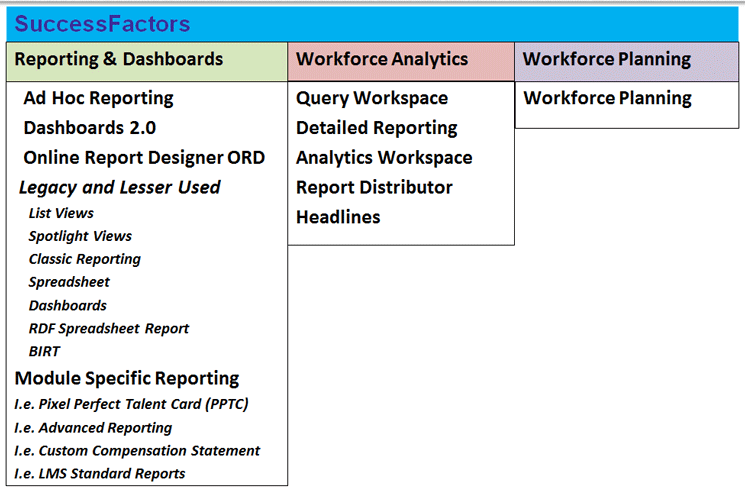 I know many companies that use SuccessFactors that were under the impression that there are only two reporting solutions as part of the suite: Workforce Analytics and Workforce Planning. Both Workforce Analytics and Workforce Planning are purpose-built analytics applications; neither is intended for transactional reporting. However, this is not the case. Behind the scenes there are many solutions that are required to report on different pieces of data.