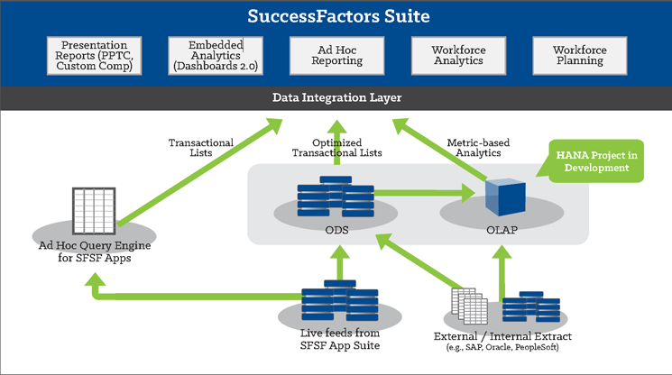 These two diagrams alone are enough to make your head spin. Many of the technical concepts and elements behind them (including operational data store [ODS], OLAP, BizX, and SAP HANA) could justify their own articles; however, in this article, my focus is on the SuccessFactors reporting solutions themselves.