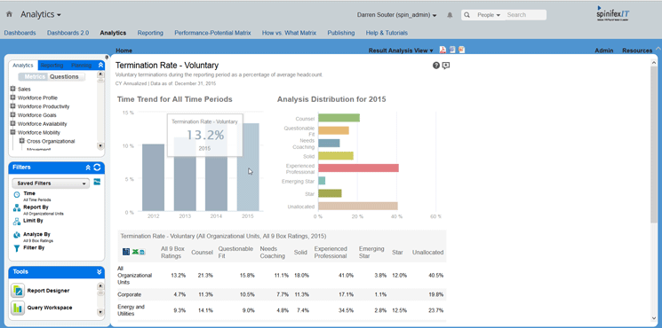 Figure 11 shows a sample of a typical KPI for voluntary terminations. Here I show it in three different ways—a trend analysis on the top left, an analysis distribution on the top right, and a table with nine box ratings on the bottom.