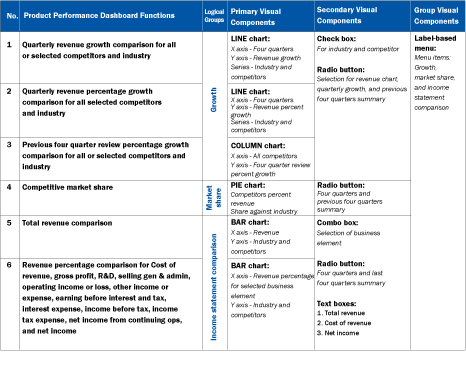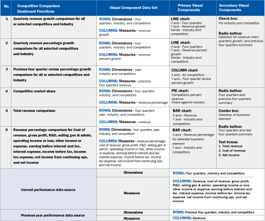 With these guidelines, you can prepare the dashboard design sheet with a list of all the functionalities, possible visuals involved, and the user interactions that operate those functionalities. By reading the guidelines, executives should get a better picture of the functions of the end product. Figure 2 contains an example dashboard design sheet that lists the functionality of a competitive comparison dashboard.