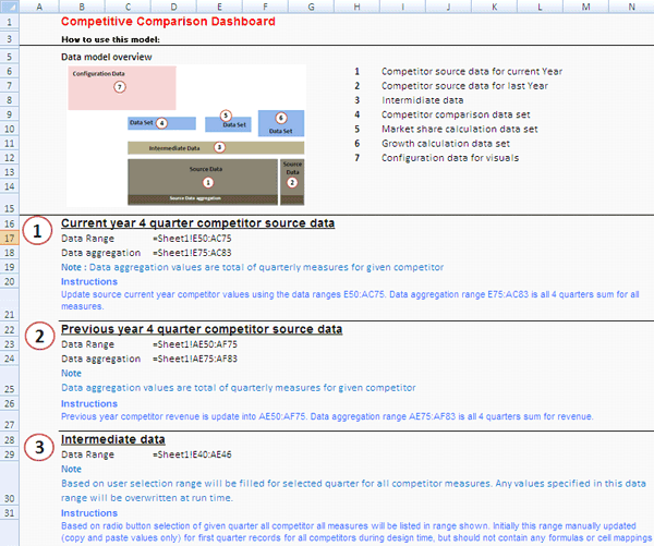 Documentation of the data model design is essential when the dashboard application might be enhanced or modified later. For example, the company might introduce new KPIs or want to display a customer satisfaction index for a new product line. Documentation is related to the data model technique used and its relationship with dashboard functionalities that build on top of it. It consists of comments, scripts, data binding areas of visual components, and special data rules that are implemented using either Excel data functions or Xcelsius components. You can record design-related information in the spreadsheet in which the data model is implemented. Figure 9 illustrates a sample documentation maintained for the competitive comparison dashboard.
