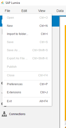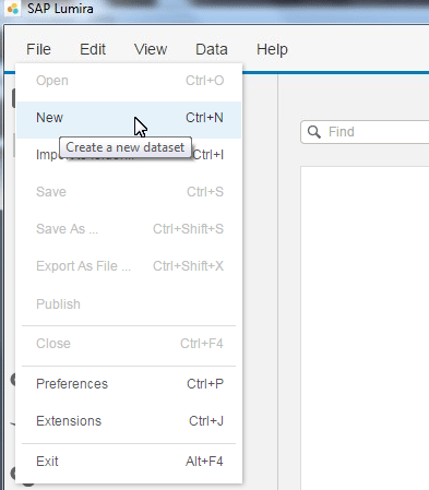 4. Log on to SAP Lumira, select File and the New option to select a new data set (