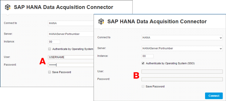 Figure 5). Notice that the User: and Password: boxes are now grayed out implying there is no need to explicitly input the user name and password for connecting to SAP HANA. Click the Connect button.